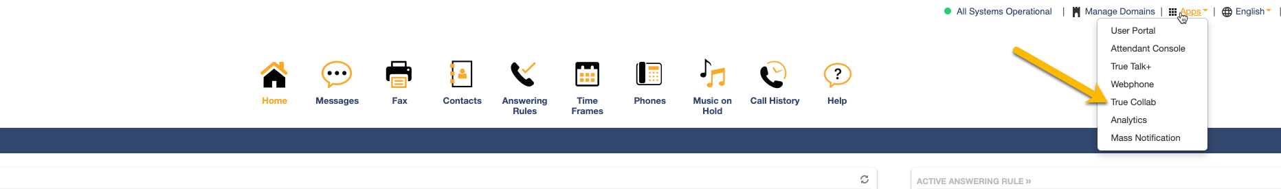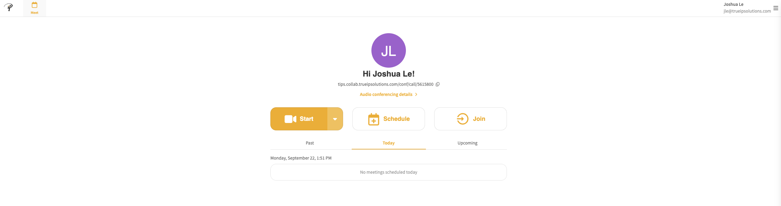 The True Collab Dashboard provides quick access to manage your Scheduled Meetings, User Settings, and if applicable, view your Recorded Meeetings.